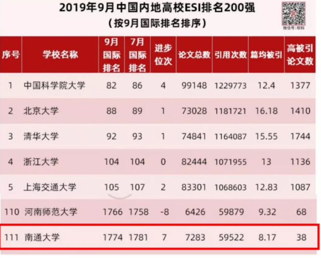 当天的数据还显示,在高校ESI排名榜单中,yl8858永利集团位列全球高校第1774名,较5月份公布的排名进步了18位;位列中国内地高校排名第111名,较5月份公布的排名进步了1位。本次数据覆盖时间范围为2009年1月1日至2019年6月30日。