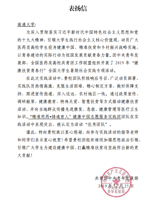 近日,我院“精准用药﹒铸魂育人”健康中国志愿服务实践团收到团中央青年发展部表扬信,向参与实践活动的指导老师和同学们表示衷心感谢。同时,团队获2019年“健康扶贫青春行”全国大学生暑期社会实践专项活动“优秀团队”。