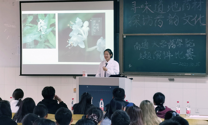 “杜康能散闷,萱草解忘忧”“苍梧来怨慕,白芷动芳馨”,道地药材早在历史变迁中与中华文化融为一体,成为一壶千年的香醇陈酿,散发出迷人的独特魅力。比赛中,15位参赛者精神饱满,准备充分。药学181张永珍从药材的种植、培育以及功效等方面介绍了自家四季产值的药材,让同学们认识到美丽的药材之乡甘肃陇西。药学202李哲的演讲让同学们了解到中草药名称与中国传统文化的渊源,传统中药背后的美丽故事,让人眼前一亮。