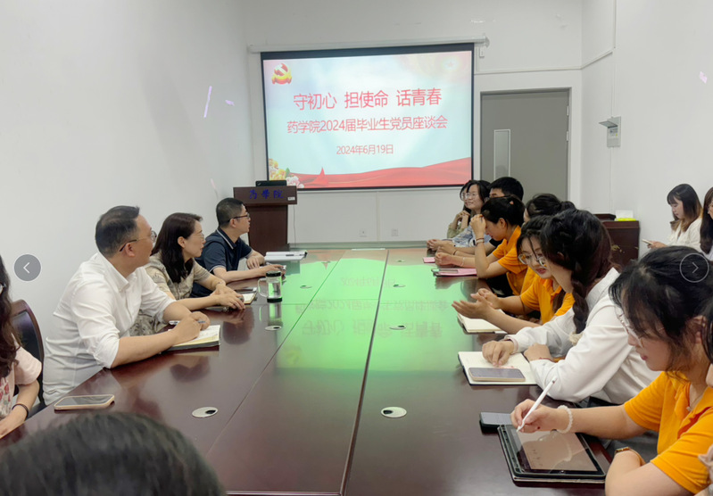 座谈会上,曹玲首先祝贺毕业生党员顺利毕业,她充分肯定了毕业生党员在学业、科研以及社会实践等方面的优异表现,对他们为学院争光添彩表示由衷的感谢。同时,她也提出了殷切的期望,希望毕业生党员们能够不忘初心、牢记使命、关注社会、关注民生,将个人理想与国家发展紧密结合,将药学知识服务于人民健康,为构建人类卫生健康共同体贡献自己的智慧和才能。包小峰强调了党员在未来职业生涯中的责任与担当,他鼓励毕业生党员在未来的工作中要严于律己、踔厉奋发、追求卓越、开拓创新,不断磨砺自己的党性,为药学事业的发展贡献自己的力量。