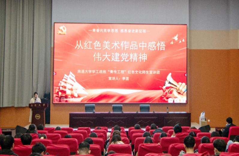 学院22级辅导员李显老师以《从红色美术作品中感悟伟大建党精神》为主题进行宣讲。她通过油画作品《启航——中共一大会议》把同学们拉回到百年前那个伟大的时刻,再现了中共一大南湖会议的历史瞬间,《我们一定会回来的》《狼牙山五壮士》等美术作品呈现出中国共产党走过的波澜壮阔的百年征程,彰显了伟大建党精神。