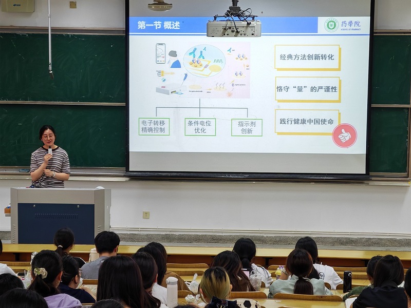 5月28日上午,yl88858永利中国开展教授本科教学示范课活动,由药物化学系习霞副教授讲授《分析化学》教学示范课,学院相关领导和部分教师来到现场观摩教学。