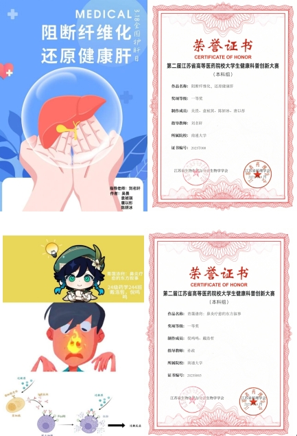 其中,由吴畏等同学创作的图文作品《阻断纤维化,还原健康肝》(指导老师:刘名轩),以生动漫画形式呼吁关注肝脏纤维化问题,荣获图文类一等奖;由倪鸣鸣等同学创作的声像类作品《青霭涤窍:鼻炎疗愈的东方叙事》(指导老师:孙政)通过动画演示,深入浅出地普及过敏性鼻炎的发生原因及预防措施,荣获声像类一等奖。