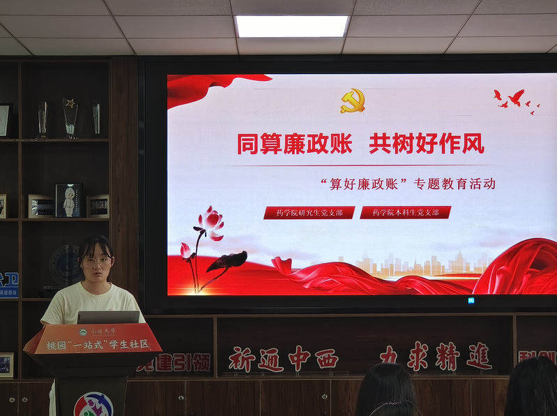 会上,研究生党支部书记卫永霞首先带领支部成员学习了相关纪律要求,剖析了典型案例,强调了在新时期背景下,“算好廉政帐”对于青年党员,特别是未来将投身医药健康事业的药学生而言,具有至关重要的现实意义和深远的历史意义。她指出,廉洁是立身之本、成事之基,必须从学生时代就扣好人生的“第一粒扣子”,筑牢拒腐防变的思想道德防线。