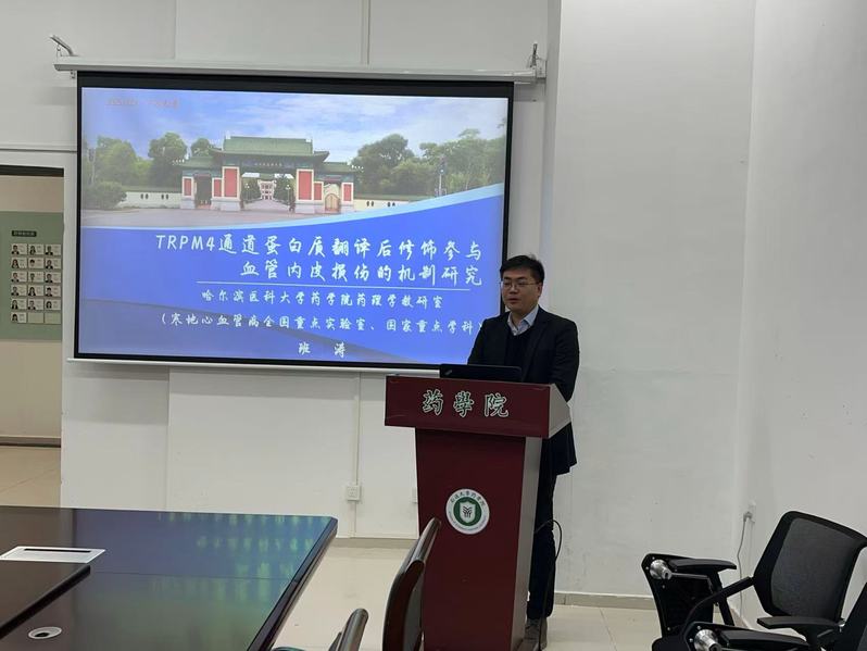 班涛教授以《TRPM4通道蛋白质翻译后修饰参与血管内皮损伤的机制研究》为题,系统性地介绍了TRPM4泛素化、SUMO化、磷酸化等修饰在糖尿病、动脉粥样硬化等血管内皮损伤中的作用及机制,并筛选出针对该靶点的多个修选化合物。本次报告为学院师生提供了宝贵的学术交流机会,进一步拓宽了该领域科研人员研究思路和方向。