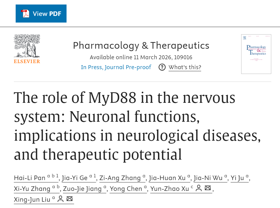 3月14日,我院神经药理实验室刘兴君教授应邀在国际期刊《Pharmacology and Therapeutics》在线发表了题目为“The Role of MyD88 in the Nervous System: Neuronal Functions, Implications in Neurological Diseases, and Therapeutic Potential”的综述文章,系统阐述了MyD88蛋白在免疫信号通路和中枢神经系统(CNS)中的研究进展,并重点阐述了其在CNS疾病如阿尔茨海默病(AD)、帕金森病(PD)、肌萎缩侧索硬化(ALS)、脑中风和颅脑损伤等,以及慢性疼痛中的功能和潜在的治疗作用。海医所潘海利教授和我院硕士研究生戈家宜为共同第一作者,附院徐云钊教授与我院刘兴君教授为共同通讯作者,该实验室研究生和我院本科生参与了部分工作。